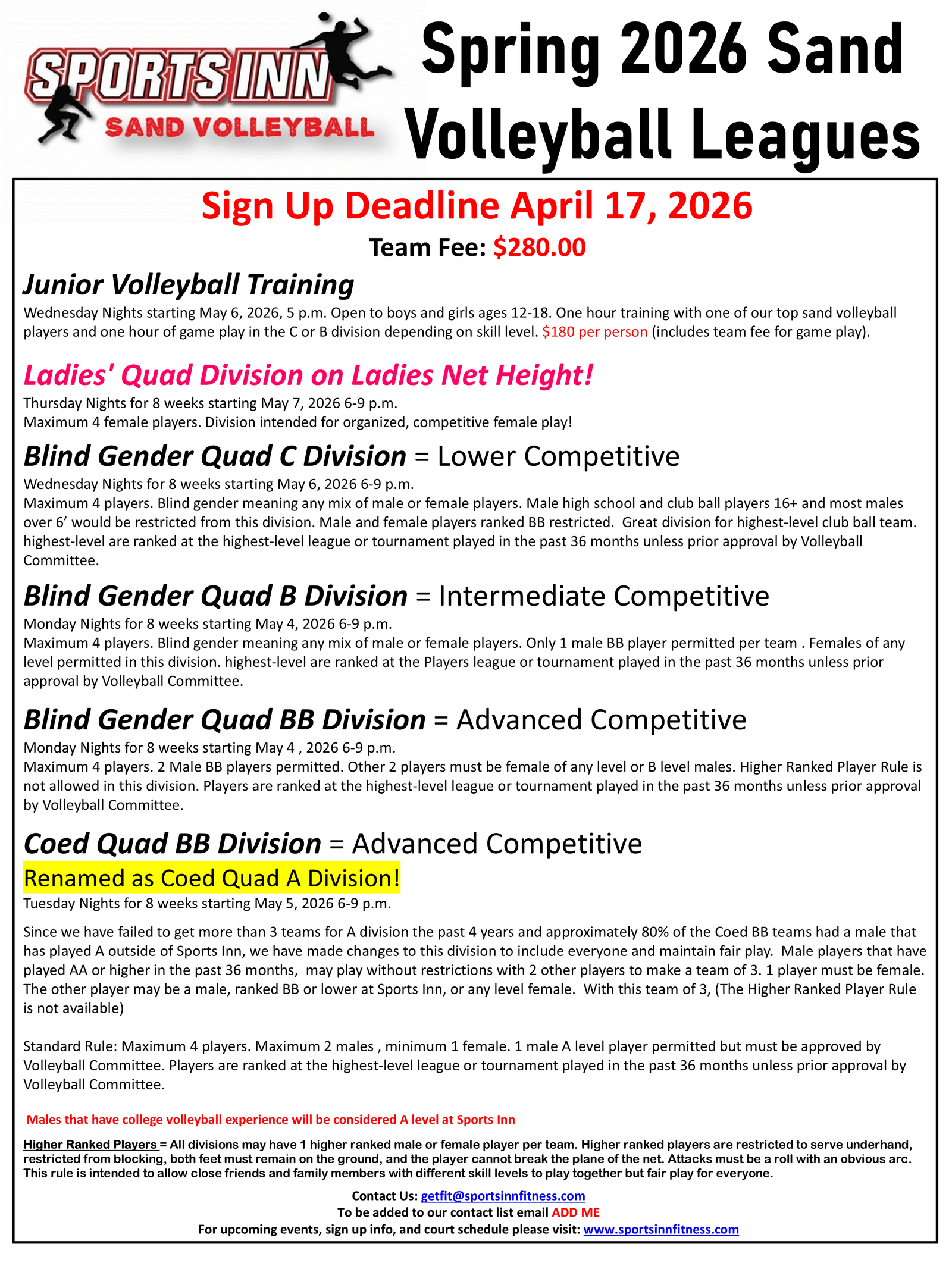 Upcoming Events$ Sand Volleyball Court Schedule$ Upcoming Events $ Event Sign Up $ Roster$ Ladies Schedule$ Ladies Standings$ Coed A Schedule$ Coed A Standings$ Co-Ed BB Schedule$ Co-Ed BB Standings$ Blind BB Schedule$ Blind BB Standings$ Blind B Schedule $ Blind B Standings$ Blind C Schedule$ Blind C Standings$ Sand Volleyball Pictures$ To Be Added To Our Volleyball Event E-mail "ADD ME" To getfit@sportsinnfitness.com
